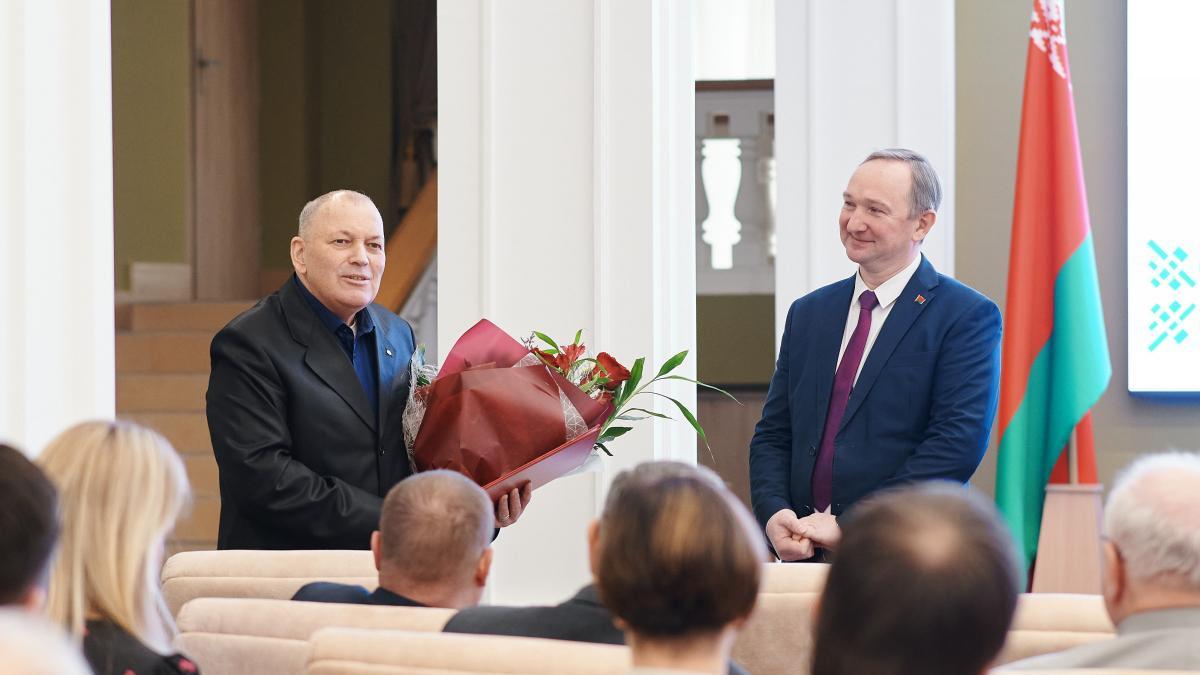 В торжественной обстановке в зале Славы БНТУ ученому в области машиностроения, академику Национальной академии наук Беларуси, ректору БНТУ (2000–2017) доктору технических наук, профессору Борису Михайловичу Хрусталеву 26 декабря была вручена медаль «Почетный ветеран БНТУ».