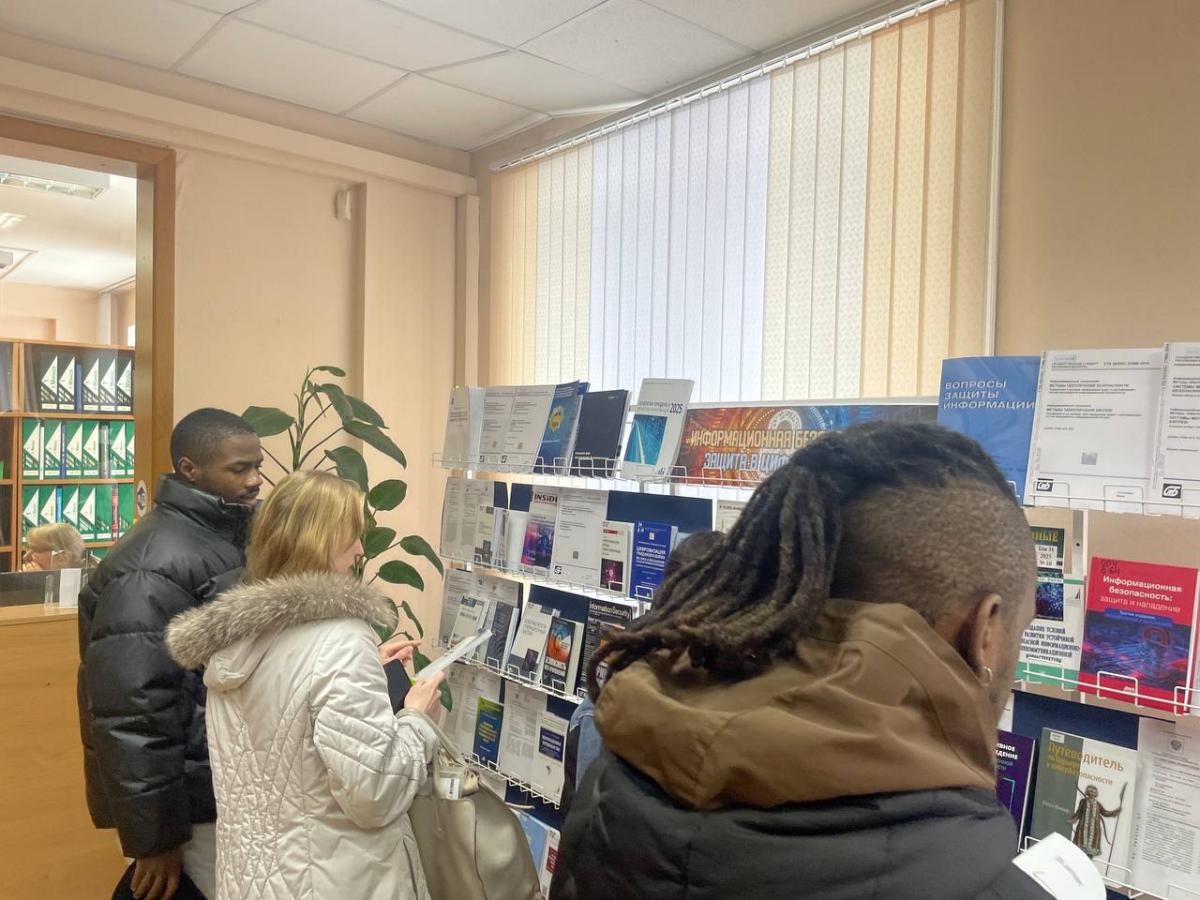 В читальном зале научно-технической литературы студенты ознакомились с тематической выставкой «Информационная безопасность: защита в цифровом мире». На выставке были представлены монографии, учебные пособия и периодические издания по фундаментальным аспектам криптографии, сетевой безопасности, управления рисками и правового регулирования защиты информации. Иностранные студенты увидели уникальные фонды технической литературы, узнали о современных электронных ресурсах и сервисах, которые РНТБ предлагает для образования и научной работы.